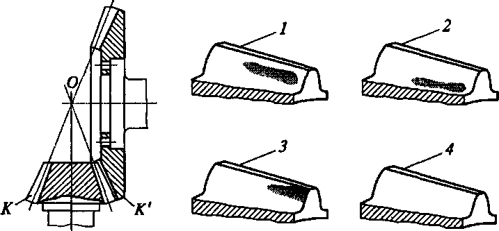 / — при нормальном зацеплении; 2 — при малом боковом зазоре между зубьями; 3 — при большом боковом зазоре между зубьями; 4 — при перекосе зубьев; К, К' — точки несовпадения затылков зубьев; О — точка пересечения осевых линий конического зубчатого соединения