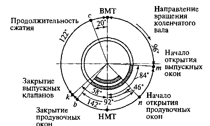 п — начало открытия окон продувки; к — закрытие клапанов выпуска; с — начало подачи топлива насосом в цилиндр; т — начало открытия клапанов выпуска газов; Ъ — закрытие поршнем окон продувки; НМТ — положение поршня в нижней мертвой точке; ВМТ — положение поршня в верхней мертвой точке