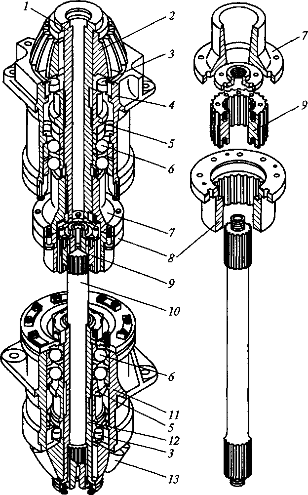 Л 12 — нижний и верхний вертикальные валы; 2, 13 — конические шестерни; 3 — роликоподшипники; 4, 11 — корпуса; 5 — распорные втулки; 6 — шарикоподшипники; 7, 8 — полумуфты; 9 — шлицевая втулка; 10 — торсионный вал