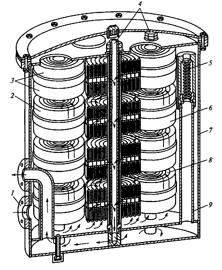 1 — входной патрубок; 2 — картонная полоска; 3 — фильтровальная бумага; 4 — пустотелые стержни; 5 — перепускной клапан; 6 — картонная лента с отверстиями; 7 — сварной цилиндрический корпус; 8 — фильтрующий элемент; 9 —