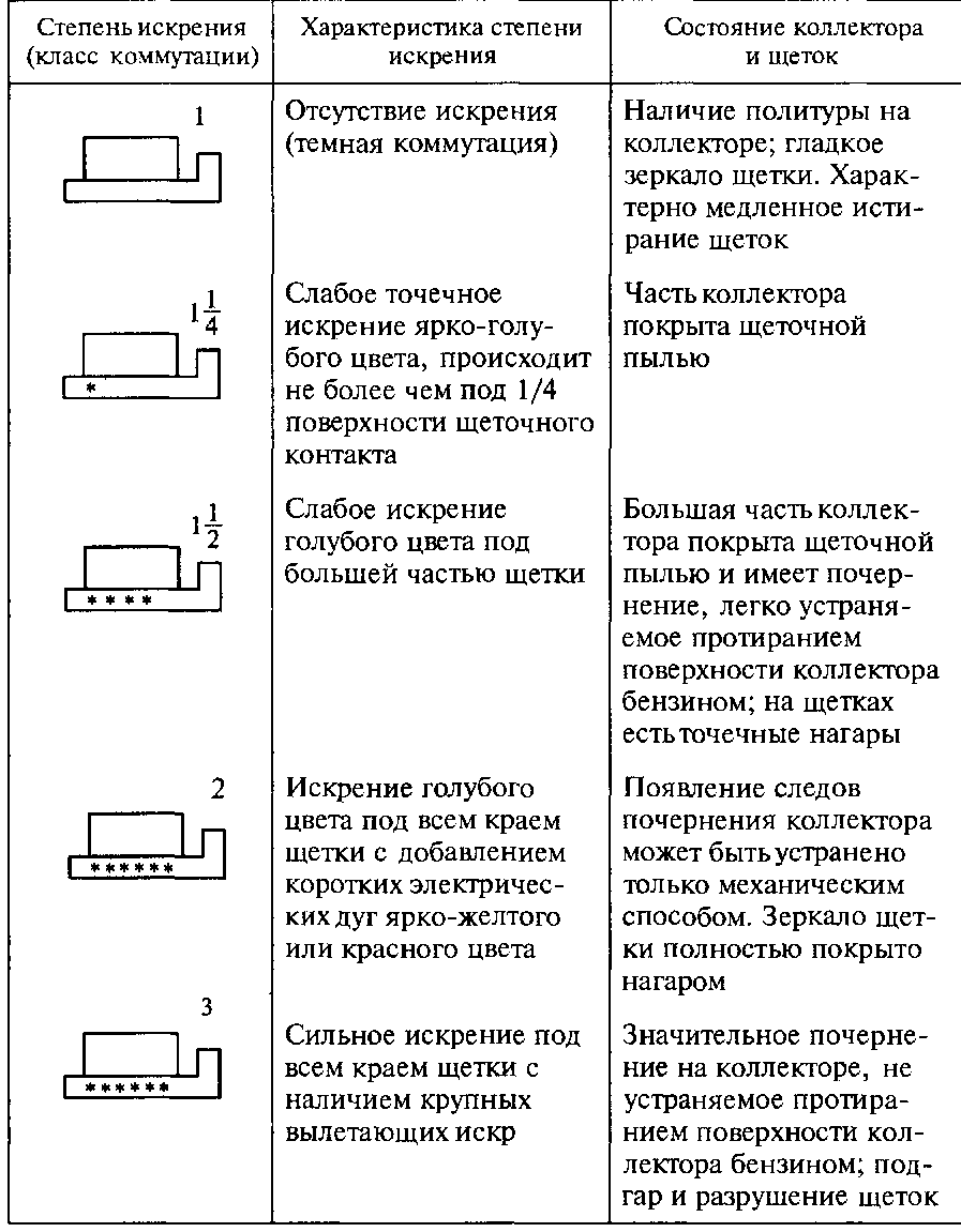 Качество коммутации оценивается степенью искрения (классом коммутации) под сбегающим краем щетки, т.е. под тем краем, из-под которого пластины коллектора выходят при своем вращении.