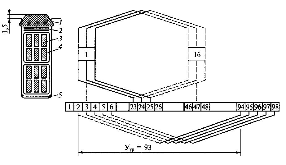 / — клин; 2 — прокладка; 3 — проводники; 4 — микалента; 5 — миканитовая прокладка; Уур — шаг уравнительных соединений; 1— 98 — номера пазов обмоток