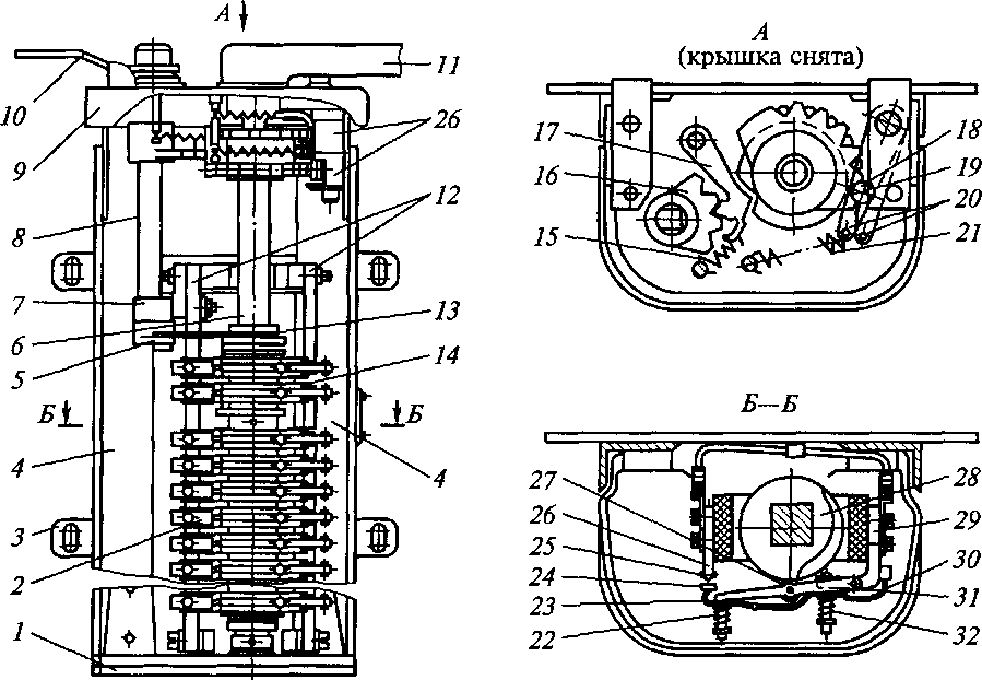 1 — дно корпуса; 2 — главный барабан; 3 — корпус; 4, 29 — угольники; 5, 20, 31 — рычаги; 6 — главный вал; 7 — кронштейн; 8 — реверсивный вал; 9 — верхняя крышка; 10 — реверсивная рукоятка; 11 — главная рукоятка; 12 — изоляционные стойки; 13 — тяга; 14 — реверсивный барабан; 15, 21, 22, 32 — пружины; 16, 19— храповики; 17— фиксатор; 18, 27— ролики; 23— подвижной контакт; 24, 25 — серебряные пластины; 26 — неподвижный контакт; 28 — пластмассовая шайба; 30 — гибкое соединение