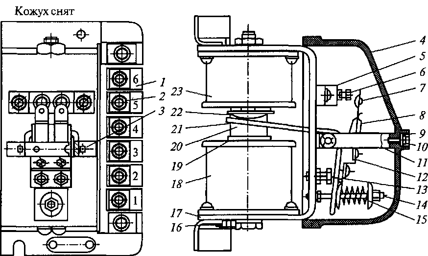 1 — изоляционная панель; 2 — контактный зажим; 3 — ось; 4 — кожух; 5 — изоляционная колодка; 6 — неподвижные контакты; 7 — подвижные контакты; 8 — контактная пружина; 9 — заполнитель; 10 — винт; //, 12 — стойки; 13 — контактодержатель; 14— шпилька; 15 — пружина; 16— болт; 17— ярмо; 18 — катушка напряжения; 19, 22 — сердечники; 20 — якорь; 21 — немагнитная напайка; 23 — катушка токовая; 1 — 6 — номера клемм на панели прибора