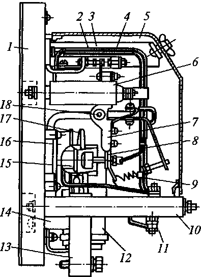 / — панель; 2, 4 — неподвижные контакты; 3 — подвижной контакт; 5 — кожух; 6 — конденсатор; 7 — рычаг; 8 немагнитная планка; 9 — пружина; 10 — изоляционная колодка; 11 — контактные зажимы; 12 — резистор; 13 — выводы токовой катушки; 14 — изоляционная планка; 15— сердечник; 16— катушка напряжения; 17 — токовая катушка; 18 — ось