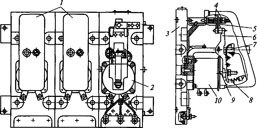 На тепловозах используют реле управления серии Р-45М, все элементы которых, кроме панелей и катушек, взаимозаменяемы. На рис. 12.12, а представлено реле управления типа Р-45М, состоящее из магнитной системы клапанного типа; пальцевого 7 и мостикового 8 контактов, установленных на панели 1. К магнитной системе реле относится ярмо 2, сердечник с катушкой 3, подвижной якорь 4. Реле заземления Р-45Г2 отличается от других типов реле серии Р-45 наличием токовой катушки вместо катушки напряжения и механической защелки, удерживающей якорь во включенном состоянии. Ток срабатывания реле заземления регулируется затягиванием пружины 5.
