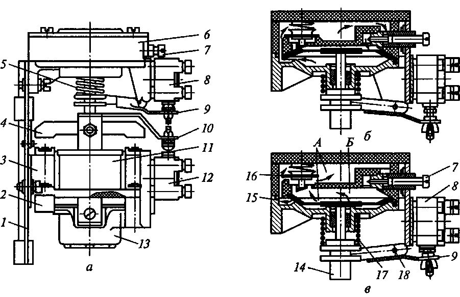 1 — основание; 2 — электромагнитный привод; 3 — ярмо электромагнита; 4 — якорь электромагнита; 5, 17 — пружины; 6 — пневматическая приставка; 7 — регулировочный винт; 8, 12 — микровыключатели; 9, 10 — рычаги; — катушка электромагнита; 13 — возвратная пружина; 14 — шток; 15 — диафрагма; 16 — клапан; 18 — ось; А, Б — воздушные полости