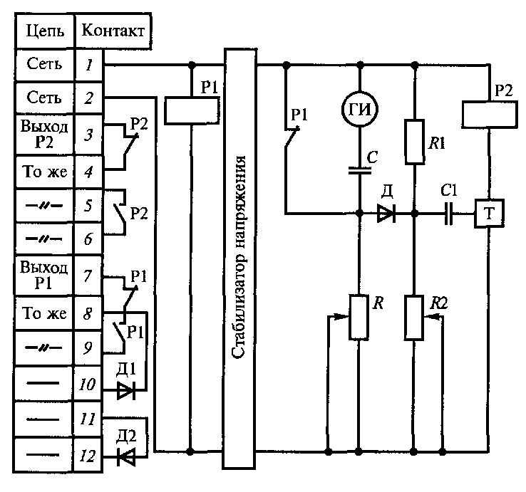 PI, Р2 — реле; С, С1 — конденсаторы; Д, Д1, Д2 — диоды; ГИ — генератор импульсов; T — триггер; R, Rl, R2 — резисторы; 1— 12 — номера клемм на