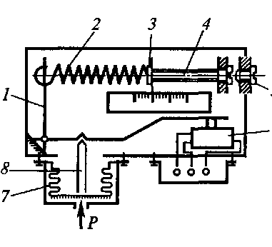 / — регулировочный винт; 2 — регулировочная пружина; 3 — шток; 4 — рычаг; 5 — винт-контакт; 6 — пружина; 7 — подвижный контакт; 8 — панель; 9 — ось рычага; 10 — мембрана