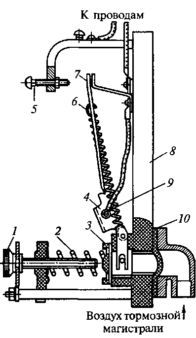 Под действием давления мембрана 10, изготовленная из листовой морозостойкой резины, прогибается и давит на шток 3, который, преодолевая усилие сжатой пружины 2, перемещает рычаг 4. Поворачиваясь вокруг оси, рычаг и пружина перебрасывают планку с подвижным контактом 7 от неподвижного контакта на винт-контакт 5, вследствие чего происходит размыкание контактов. При снижении давления воздуха в главных резервуарах усилием пружины шток возвращается в исходное положение, вновь замыкая контакты. Давление замыкания регулируется винтом 1, а давление размыкания — винтом 5.