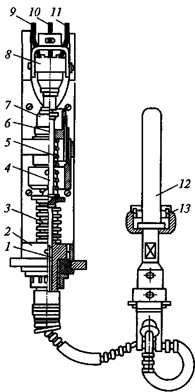 Г— капиллярная трубка; 2 — корпус реле; 3 — сильфон; 4 — толкатель; 5 — пружина; б — стопорный винт; 7 — штуцер; 8 — микровыключатель; 9, 10, 11 — выводы; 12 — термобаллон; 13 — накидная гайка