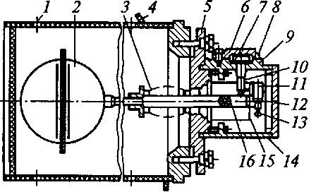 1 — ограждение; 2 — поплавок; 3 — сильфон; 4 — водяной бак; 5, 8 — фланцы; 6, 12 — крышки; 7 — кольцо пружинное; 9 — корпус; 10 — стопорный винт; И — микровыключатель; 13 — регулировочный болт; 14 — уплотнение; 15 — кронштейн; 16— рычаг