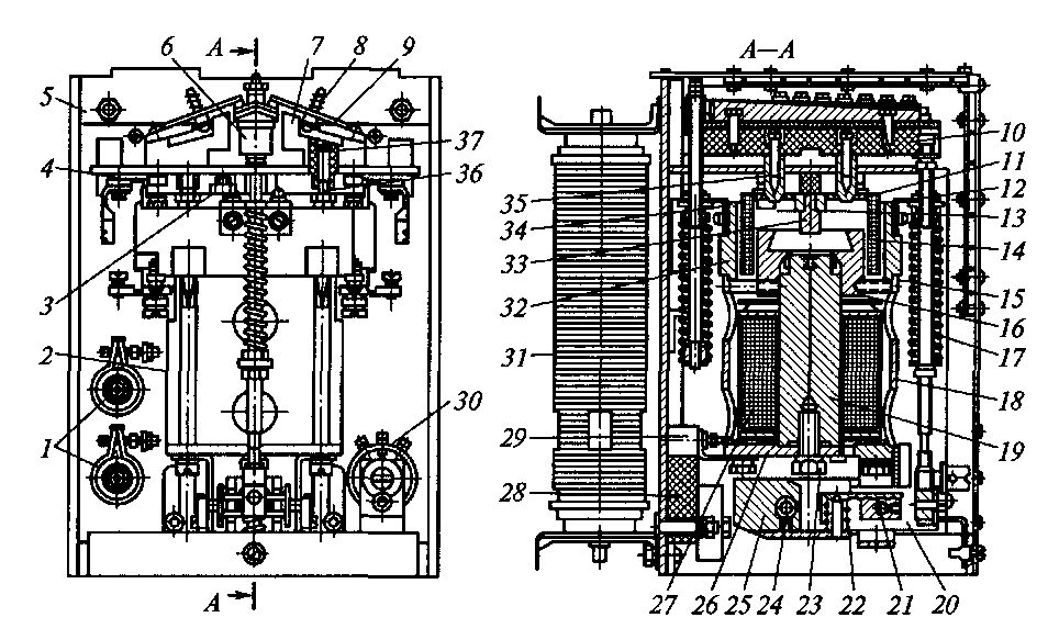 1 — резисторы обратной связи; 2 — шпилька; 3 — регулировочный болт; 4 — перегородка; 5— основание; 6, 7, 28— изоляционные колодки; 8— пружина; 9 — контакты; 10 — подвижная колодка; 11 — шайба; 12 — кольцо; 13 — диск; 14 — обмотка напряжения; 75— токовая обмотка; 16 — наконечник; 77— цилиндрическая пружина; 18 — стакан; 19 — сердечник; 20 — рамка; 21, 24 — оси; 22 — пружина противовеса; 23 — болт; 25 — груз; 26 — плита; 27 — неподвижная катушка; 29 — угольник; 30 — реостат «Корректировка напряжения»; 31 — резистор СР; 32 — корпус; 33 — упор; 34 — скоба; 35 — бонка; 36, 37 — винты