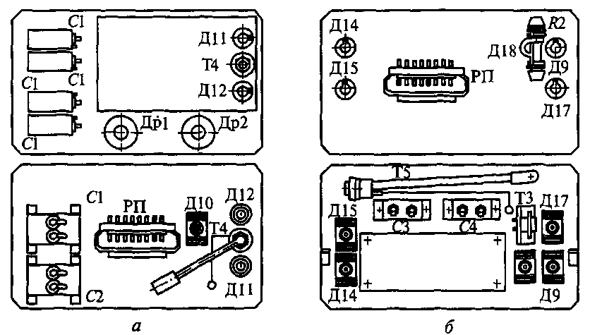 а — левая; б — правая; С1—С4 — конденсаторы; Д9— Д12, Д14, Д15, Д17, Д18 — диоды; Л2 — резистор; Др1, Др2 — дроссели; ТЗ — транзистор; Т4 — тиристор;