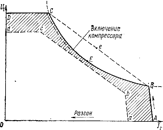 В точках В и С , где номинальная мощность дизеля соответствует мощности генератора, золотника перекроет впуск масла в сервопривод, а на участке ВЕС будет занимать положение впуска масла на уменьшение нагрузки, причем максимально вдвинутое положение якоря датчика будет в точке е, где несоответствие между этими мощностями максимально. В точках кривой СЕВ, где номинальная мощность дизеля и расходуемая соответствуют друг другу, золотник 4 займет положение перекрытия впускных отверстий. Таким образом, объединенный регулятор дизеля на участках аЬ и сё селективной характеристики увеличивает ограничиваемые ток и напряжение генератора (участки АВ и СО), а на участке Ъс корректирует мощность отбора в кривую ВЕС постоянной мощности дизеля. Однако в условиях тепловоза мощность дизеля расходуется дополнительно на привод различных вспомогательных механизмов, компрессора, вентилятора и др., изменяющих режим своей работы.
