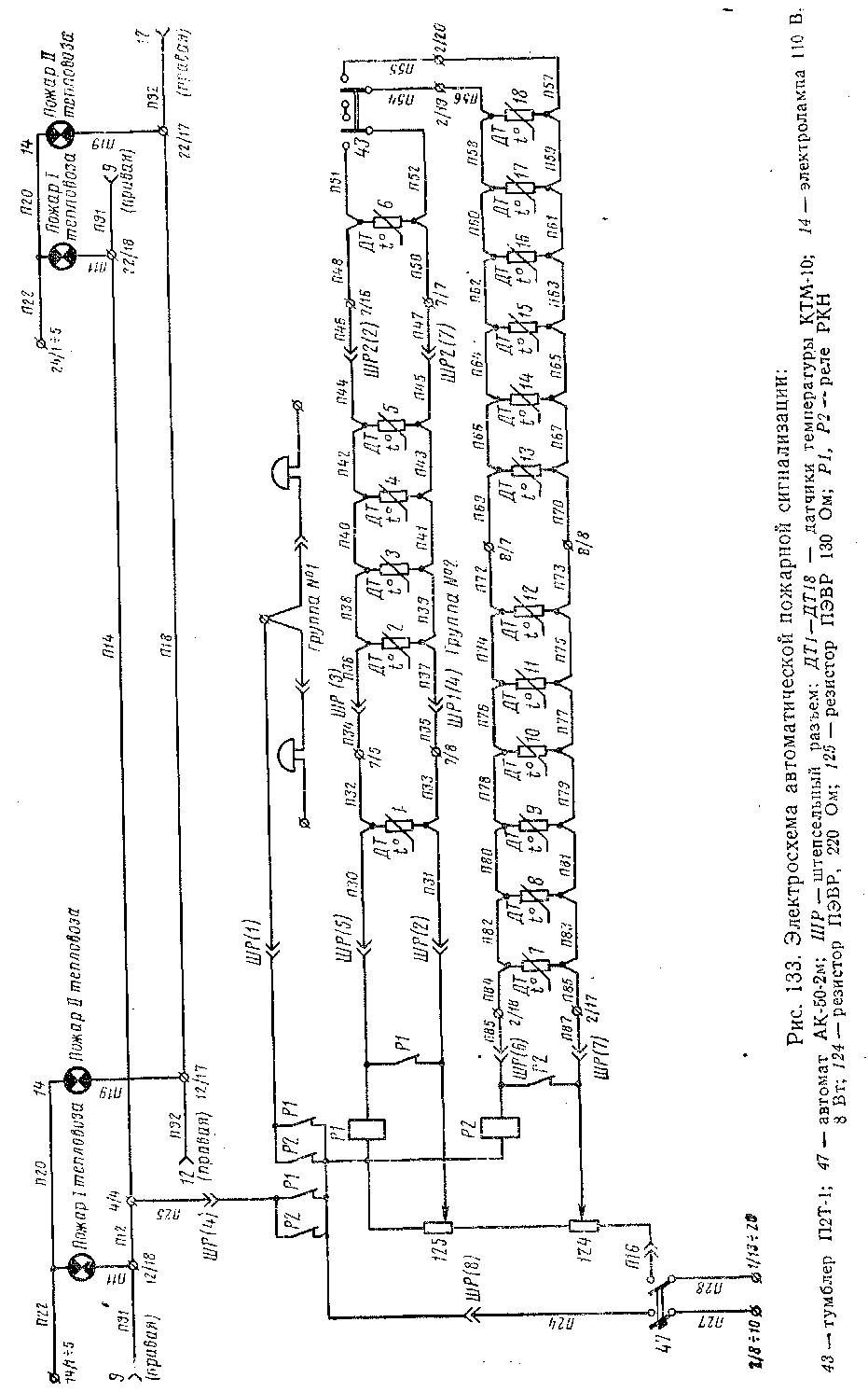 В зависимости от максимально возможных температур места установки датчиков разделены на две зоны. К одной из них относятся камера электрооборудования и крыша кузова над дизелем (максимальная рабочая температура + 80° С), к другой ■— стенки дизельного помещения (максимальная рабочая температура + 60° С). Соответственно для исключения ложного сигнала схема разделена для двух групп датчиков: первая группа имеет напряжение питания 28 В, вторая— 40 В. Кроме этого, производится разделение датчиков по плюсовым (1-я группа) и минусовым (2-я группа) допускам сопротивления. Необходимые напряжения для питания снимаются с потенциометров, установленных на панели промежуточных реле. При срабатывании одного из датчиков включается реле Р1 или Р2. Реле своими контактами включает сигнальные лампы «Пожар» и зуммеры на пультах машиниста. Одновременно одним из контактов реле становится на самопитание. При работе по системе двух единиц сигнал подается через межтепловозное соединение. Исправность схемы проверяется тумблером 43, В крайних положениях его контакты шунтируют датчики групп, вызывая срабатывание соответствующего промежуточного реле.