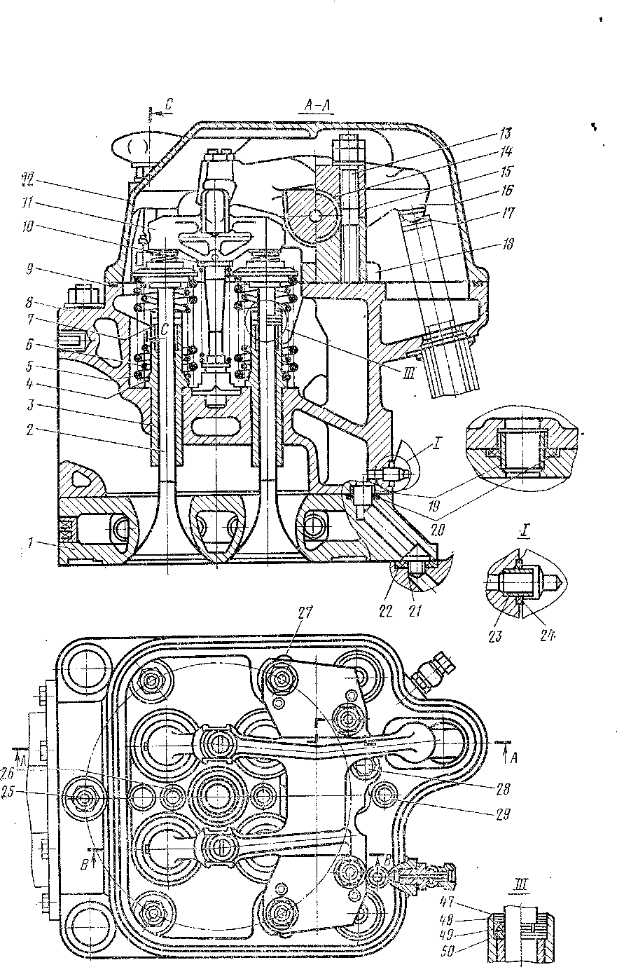 Крышка цилиндра. Чугунное днище 1 крышки цилиндров (рис. 9) соединено с алюминиевой крышкой 8 двумя шпильками 26, служащими одновременно для крепления форсунки, шестью шпильками 25, скрепляющими крышку и втулку цилиндра, и четырьмя шпильками, крепящими крышку цилиндра к блоку. В нижней части днища имеется кольцевая канавка для уплотнения «газового стыка» между крышкой и втулкой цилиндра. В крышке размещены форсунка и четыре выпускных клапана. Выпускные клапаны 2 притерты к гнездам, образованным в чугунном днище, и вставлены в крышку снизу. Для направления и уплотнения шпинделей выпускных клапанов в крышку 8 запрессованы четыре чугунные втулки 3 с металлокераыическими втулками 7 и уплотнительными кольцами 49 и 50 из фторопласта, которые удерживаются во втулке 3 от выпадания кольцом 48 и упругим кольцом 47. На уплотнительных кольцах установлены пружины, прижимающие их к шпинделю клапана. Отгибы пружинок фиксируют положение колец 49 и 50 так, чтобы вырезы колец были смещены на 90°.
