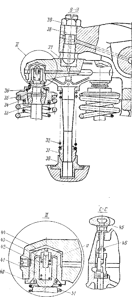/ — днище; 2 — выпускной клапан; З — чугунная втулка; 4, 34 — тарелки; 5, 6, 32, 42, 51 — пружины; 7 — уплот-нительная втулка; 8— крышка; 9 — резиновая прокладка; 10 — шайба; 11 — траверса; 12 — колпак; 13, 25, 26 — шпильки; 14 — втулка подшипника; 15, 18, 29 — стойки; 16 — рычаг; 17 — головка; 19, 21, 23 — трубки; 20, 22, 24 — резиновые уплот-ннтельиые кольца; 27 -— переходная гайка; 28 — болт; 30 — гнездо; 31 — направляющая втулка; 33 — разрезной сухарь; 35 — колпачок; 36 — пружинное кольцо; 37 — сухарь; 38 — пажнмной болт; 39 — контргайка; 40 — втулка гидротолкателя; 41 — толкатель; 43 — упор; 44—■ шарик; 45 — маховичок; 46 — винт; 47 — упругое кольцо; 48 — кольцо; 49, 50 — уплот-пительпые кольца; а — полость гидротолкателя