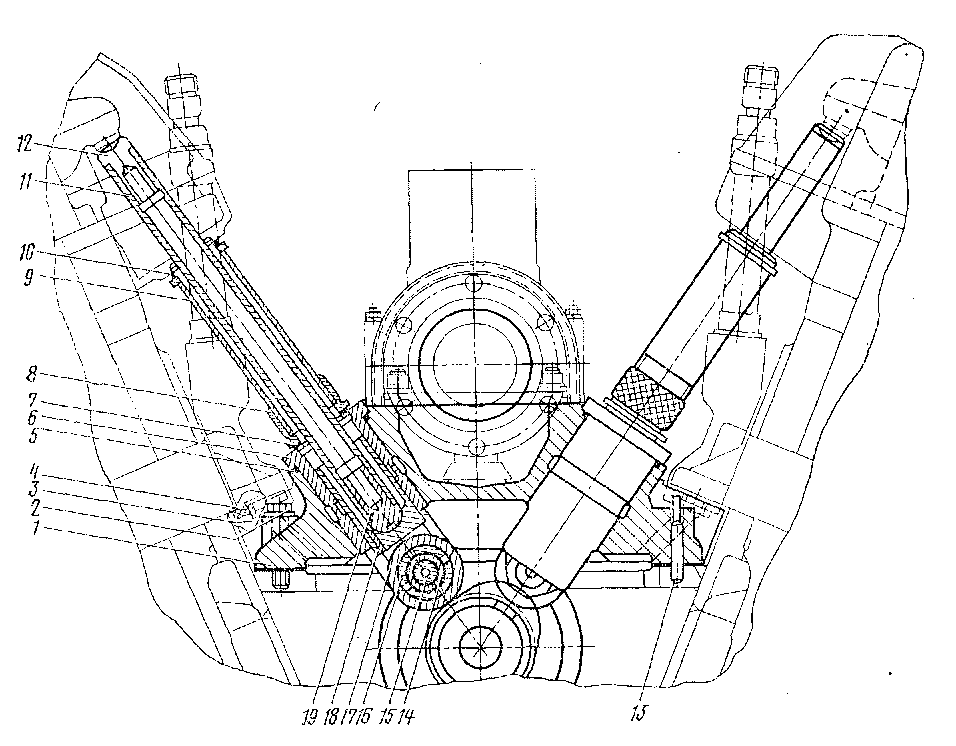 Блок цилиндров. Цельносварная конструкция блока цилиндров (рис. 6) У-образной формы разделена поперечными стойками на шесть секций, в которых размещены втулки цилиндров. Верхние плиты 10, средние 8 и нижние 7 продольные листы имеют отверстия, которые образуют опорные пояса для втулок цилиндров. Пространство, ограниченное верхними 10 плитами, средними 8 продольными листами, поперечными У-образными 29 и торцовыми 18 стойками, является полостью водяного охлаждения втулок цилиндров.