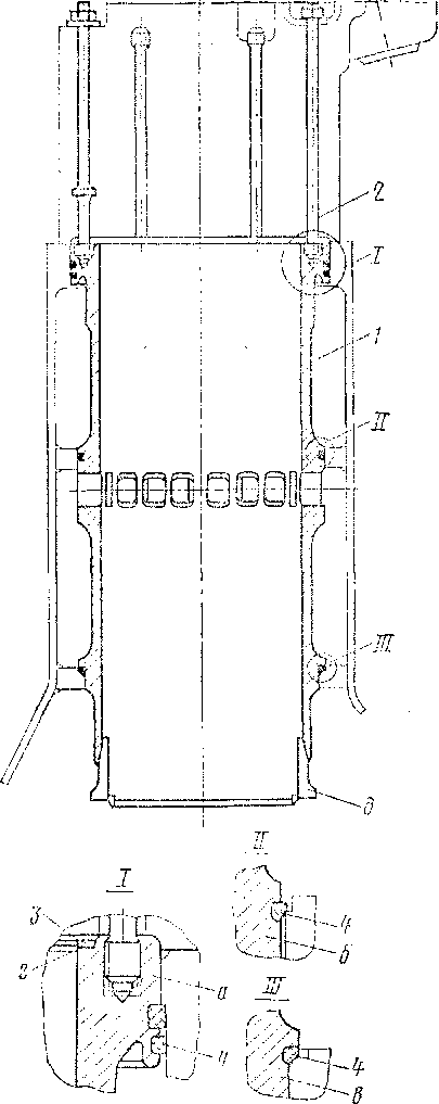 Втулка цилиндра. К крышке цилиндра подвешена втулка цилиндра (рис. 8), благодаря чему газовый стык крышки с втулкой полностью разгру-** жен. На верхнем опорном бурте" втулки 1 имеется кольцевая площадка для прокладки 3 из мягкой стали с омеднением, уплотняющей газовый стык между крышкой цилиндра и втулкой. На опорной поверхности прорезаны кольцевые канагжи г, способствующие лучшему уплотнению. Втулка скреплена с крышкой цилиндра шестью шпильками 2, ввернутыми в борт втулки. Втулка относительно крышки цилиндра фиксируется буртом днища крышки по внутреннему диаметру втулки и пояском на шпильке. Эта шпилька установлена в отверстие втулки цилиндра со стороны выпуска. В блоке втулка фиксируется верхним а, средним б и нижним в опорными поясами. Наружная поверхность втулки между верхним а и средним б поясами омывается водой. В средней утолщенной части втулки равномерно по окружности расположено восемнадцать окон, через которые воздух поступает в цилиндр. Наружная поверхность втулки между средним и нижним поясами охлаждается наддувочным воздухом. Между опорными поясами блока и втулки цилиндра для уплотнения установлены кольца 4 повышенной теплостойкости, изготовленные из разных сортов резины. Верхнее кольцо верхнего опорного пояса маркировано белой краской, нижнее кольцо верхнего опорного пояса—без маркировки, а кольца, устанавливаемые в средний и нижний опорные пояса, маркированы желтой краской. Два выреза д в нижней части втулки служат для прохода стержня шатуна при работе дизеля, а два отверстия-—для крепления приспособления, удерживающего поршень при выемке комплекта.