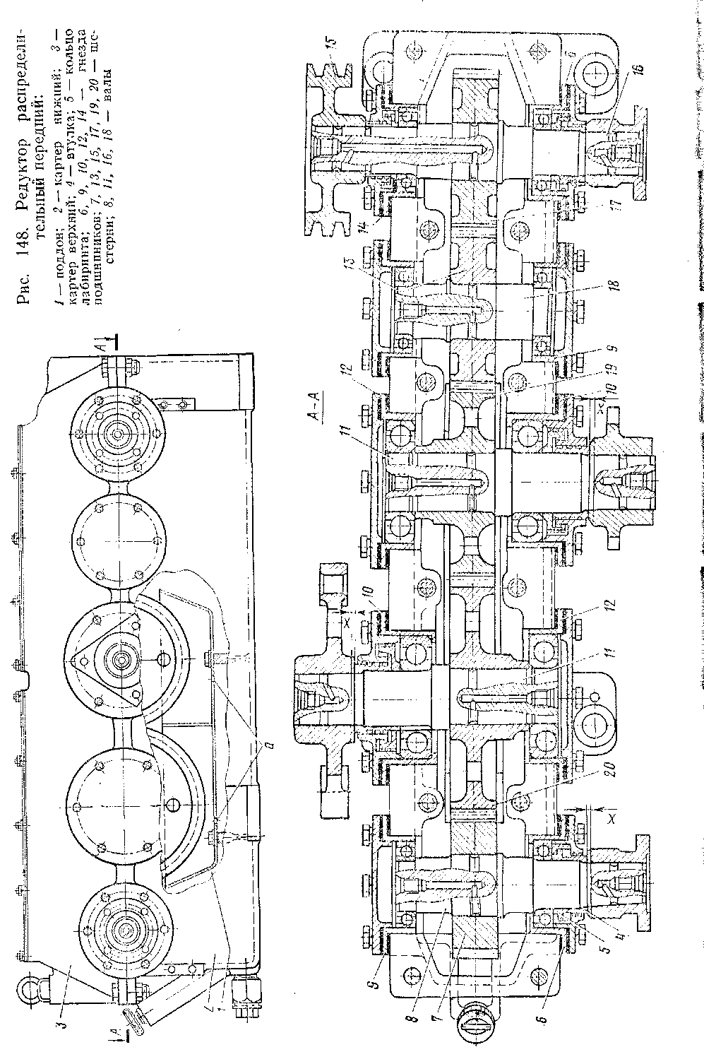 Передний распределительный редуктор. Передний распределительный редуктор (рис. 148) — это простой по конструкции цилиндрический редуктор с косозубыми шестернями, расположенными в один ряд. Направление вращения ведущего вала (если смотреть со стороны привода) по часовой стрелке. В литом чугунном корпусе редуктора на шарикоподшипниках поставлены пять валов. Корпус редуктора состоит из верхнего 3 и нижнего 2 картеров, соединенных между собой шпильками, которые ввернуты в приливы на внутренней стороне стенки нижнего картера. Аналогичные приливы с отверстиями имеются и на верхнем картере. Гайки на шпильках затягивают через два люка, расположенных сверху верхнего картера. Люки закрывают крышками с прокладками и крепят на шпильках. Для фиксации взаимного расположения картеров служат четыре призонных болта (по краям редуктора). По плоскости разъема картеры уплотнены шелковой нитью толщиной 0,1—0,2 мм. В картерах для установки валов имеются пять продольных расточек, в которые установлены гнезда подшипников. Гнезда подшипников 10 ведущего вала и вала привода двухмашинного агрегата устанавливают с зазором 0—0,067 мм, остальных валов — с зазором 0—0,058 мм.