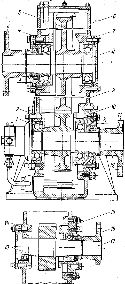 5, 13 — шестерни; 2, 4, 7, 10, 14, 15 — гнезда подшипников; 3, 11, 16 - фланцы; 6 - картер верхний; 8, 12, 17 — валы; 9 — картер нижний