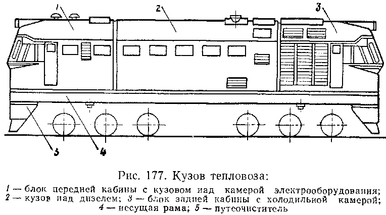 Кузов тепловоза М62 (рис. 177) состоит из четырех частей: несущей рамы 4, блока передней кабины с кузовом над камерой электрооборудования (проставки) /, блока задней кабины с холодильной камерой 3; кузова над дизелем 2 и путеочистителей 5. Конструкция передней и задней кабины одинаковая. В 1964 г. кузов был всесторонне испытан на прочность. Испытания показали, что кузов полностью удовлетворяет требованиям прочности по усталости, а также прочности при предельных статической и ударной нагрузках 250 тс. Кроме того, кузов обладает необходимой прочностью при аварийной подъемке тепловоза. При аварийной подъемке полностью экипированного тепловоза его можно поднимать вместе с тележкой за один конец рамы (за выступы для крепления буферов), если рама опирается противоположным концом на другую тележку. При этом тележка поднимается вместе с кузовом при помощи специального устройства, размещенного в шкворне рамы.