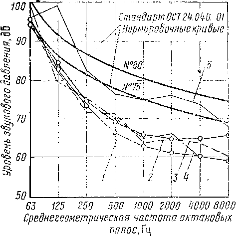 3 — место машиниста секции А тепловоза 2ТЭН6; 4 — место машиниста секции Б тепловоза 2ТЭпй; 5 — спектрограмма воздушного шума в кабине машиниста тепловоза 2ТЭ10Л в обычном исполнении