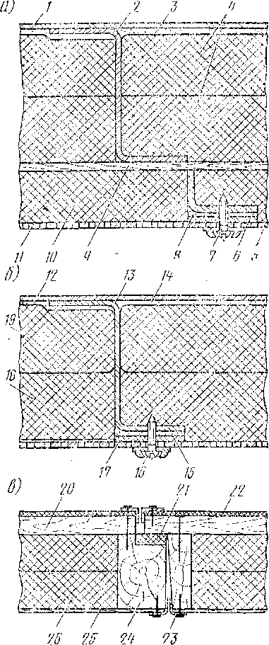 а — задняя стенка кабины машиниста; б — боковая стенка кабины машиниста; в — полы в кабине машиниста; /, 12 — стальная наружная обшивка кузова; 2, 13 — стальной каркас; 3, 8, 14, 15 — мастика; 4, 19, 26 — стеклоплиты; 5 — перфорированный алюминиевый лист; 6, 17 — картон; 7, 16 — самонарезные шурупы; 9, 20, 25 — фанера; 10, 18 — отходы штапельного волокна; // — стеклоткань; 21 — резина; 22 — линолеум; 23 — окантовка; 24 — деревянный брусок