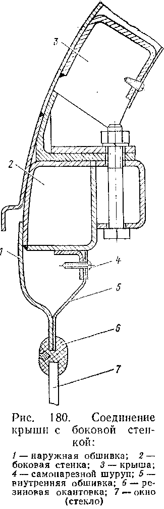 Крыша в свою очередь имеет несколько быстросъемных люков для демонтажа агрегатов. Соединение крыши с боковой стенкой изображено на рис, 180,