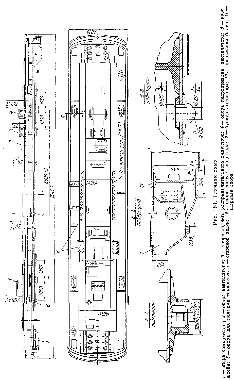Между продольными балками и обносным швеллером приварены настильные листы толщиной 4 мм. В местах, где настильные листы образуют пол тепловоза, приварены рифленые листы толщиной 4 мм. В средней части рамы с наружной стороны продольных балок приварены по два кронштейна 5 для крепления топливного бака. Снизу рамы на листах толщиной 18 мм приварены два литых шкворня наружным диаметром 300 мм, имеющих сменные кольца. Вокруг каждого шкворня на диаметре 2730 мм расположены четыре шаровых опоры 11 для передачи веса надтележечного строения. Рама в этих местах имеет усиления. В зоне передних и задних опор на усиленном кронштейне к обносному швеллеру приварены опоры 6 для подъема тепловоза на домкратах при ремонтах. Недалеко от шкворня между обносным швеллером и продольными балками вварены четыре бункера песочной системы 9 емкостью по 125 кг каждый.