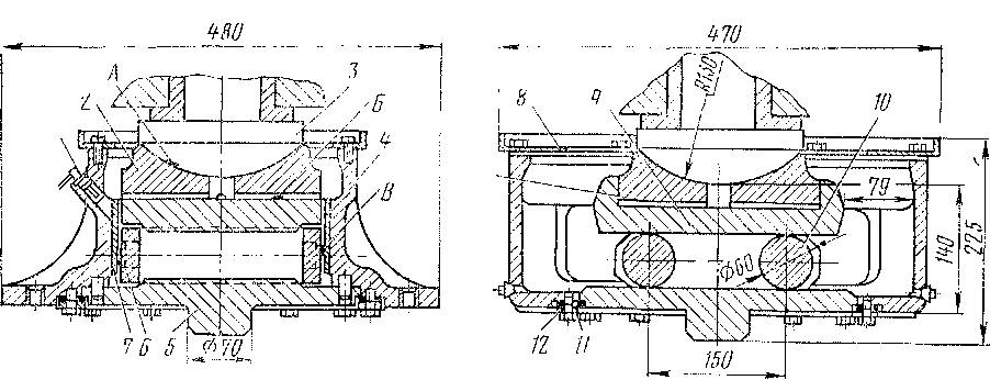 Рис. 182. Опорно-возвращающее устройство: 1 — маслоуказатель; 2 —гнездо; 3 — шаровая опора; 4 — корпус; 5 — нижняя опорная плита-5 —обойма; 7 — планка; 8 — крышка; 9 — верхняя опорная плита; 10 — ролик; //— кольцо-12 — прокладка; А, Б, В, Г — поверхности