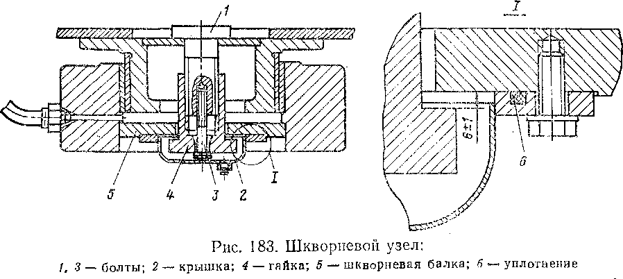 Шкворневой узел. Соединение рамы кузова с тележкой изображено на рис. 183. При подъемке тепловоза за приливы буферов рамы кузова тележка может подниматься вместе с кузовом при помощи специальной гайки 4, навинчиваемой на болт /, приваренный к раме кузова. При подъемке кузова гайка своим фланцем упирается в дно шквор -невой балки 5 тележки и поднимает ее. Для стопорения гайки применяется болт 3 с левой резьбой. Снизу шкворневое гнездо закрывается крышкой 2 с резиновым уплотнением 6. При сборке устанавливают зазор 6 ± 1 мм между фланцем гайки и дном шкворневой балки. Этот зазор необходим для обеспечения перемещения кузова относительно рамы тележки при накатывании роликов опор на наклонные поверхности плиты.