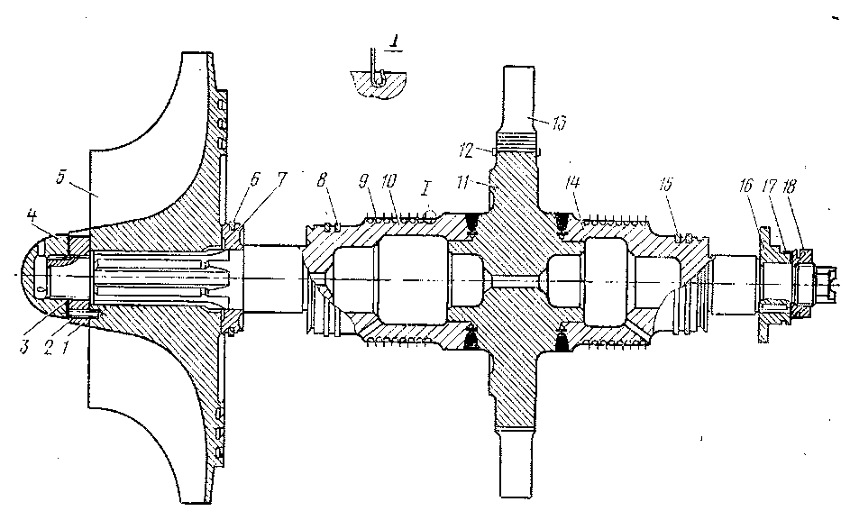 і —гайка; 2 — винт; 3 — пластинчатый замок; -/ — обтекатель; 5 - колесо компрессора- 6 8 15- уплотнительные кольца; 7-втулка; 9 - гребешок; 10, 14 - полые валы; //-турбинный диск; 12 — замочная пластина; 13 — рабочая лопатка;' 16 — упорная втулка- 17 — стопорная шайба; 18 — упругая гайка