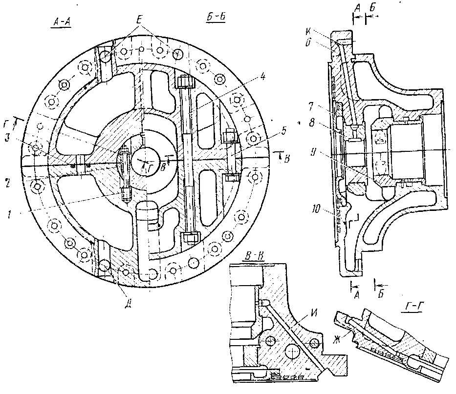 Проставок. Стенки проставка (рис. 17) двойные для прохода охлаждающей воды. Полости охлаждения половинок проставка соединены между собой отверстиями с уплотнительными резиновыми кольцами 3, а с полостями выпускного корпуса — отверстиями Д в нижней половинке и отверстиями Е в верхней половинке. В средней части проставка имеются два прилива, в одном из которых расположен опорный подшипник 8, в другом — разъемная втулка 9, которая с гребешками ротора образует лабиринтное уплотнение.