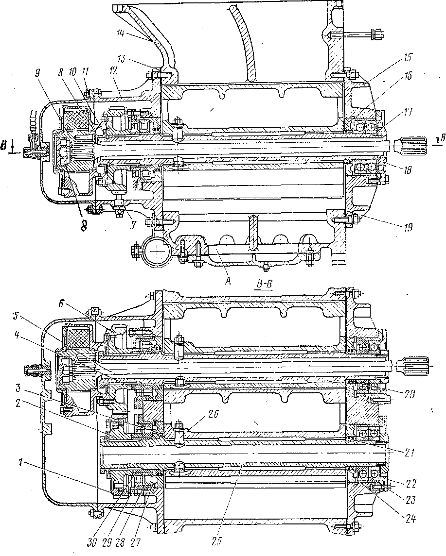 Нагнетатель. Нагнетатель объемного типа приводится от колей-чатого вала дизеля. Сверху к фланцу корпуса (рис. 18) нагнетателя прикреплен переходный патрубок к турбокомпрессорам. На боковых сторонах корпуса имеются каналы для прохода воздуха в ресивер дизеля. Роторы можно осматривать через окно А в нижней части корпуса. В крышке сделано отверстие, закрытое пробкой, для слива конденсата. Нагнетатель прикреплен к редуктору фланцем специальными болтами и шпильками.