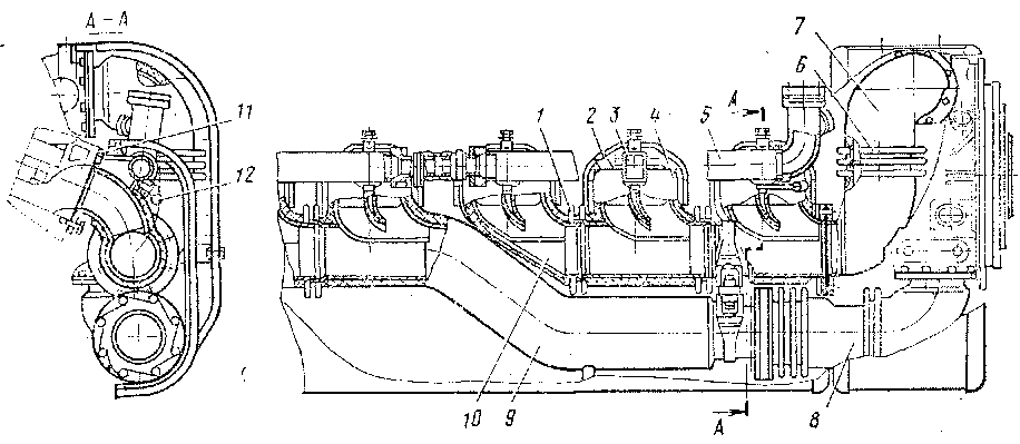 Коллекторы неохлаждаемы. Между звеньями коллектора установлены компенсаторы / линзового типа из жаростойкой листовой стали. Коллекторы соединены с газовыми улитками турбокомпрессоров патрубками 7 и 8, в которые вварены компенсаторы 6. Для уменьшения теплоотдачи в окружающую среду коллекторы покрыты мастичной изоляцией, состоящей из смеси асбестового волокна, жидкого стекла и формовочной глины. Кроме того, коллекторы с патрубками защищены специальными закрытиями, в которых имеются теплоотражатели. Соединения коллекторов уплотнены асбостальными прокладками. Переток воды из крышек цилиндров в коллекторы уплотнен резиновыми прокладками //. Для укладки проводов термопар на коллекторах предусмотрены скобы 12.