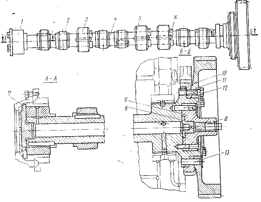 Распределительный вал вращается в семи подшипниках, из которых крайний с передней стороны является опорно-упорным. Шейка вала, лежащая в крайнем подшипнике с задней стороны, выполнена за одно целое с валом, остальные шейки представляют собой круглые шайбы. с закаленной поверхностью. Шайбы 3 насаживаются на вал в горячем состоянии на шпонках 5 и от осевого перемещения застопорены винтами 6. Диск 7, препятствующий осевому перемещению распределительного вала, прикреплен к торцу шайбы / болтами и расположен между торцом упорного подшипника и его крышкой. Диск 7 закрывает отверстие вала.