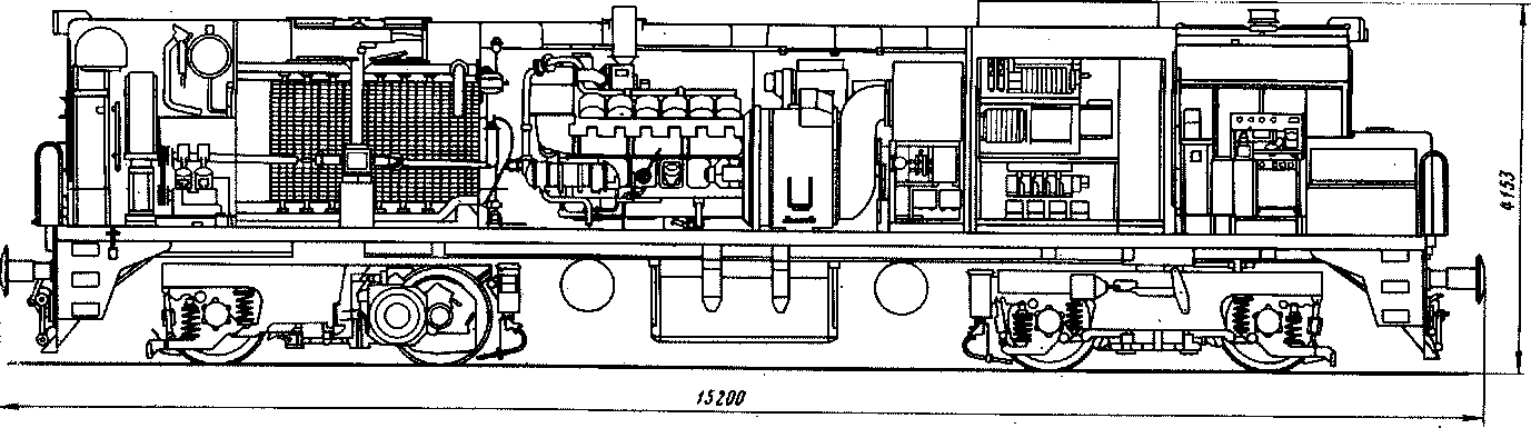 Кузов тепловоза капотного типа с одной кибиной машиниста. Сварная рама кузова при испытаниях выдерживает сжимающее )і-илие до 200 т.