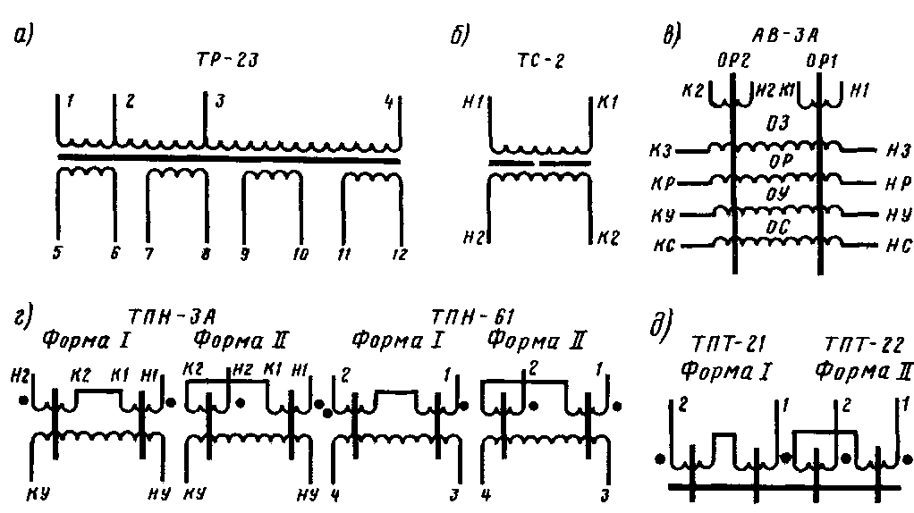 Рис. 11. Особенности изображения трансформаторов и магнитных усилителей: а — распределительный трансформатор ТР-23; б — стабилизирующий трансформатор ТС-2; в — ампли-стат АВ-ЗА; г — трансформаторы постоянного напряжения ТПН-ЗА, ТПН-61; д — трансформаторы постоянного тока ТПТ-21, ТПТ-22