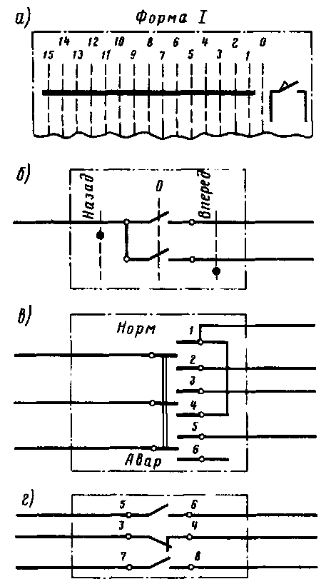 Рис. 12. Особенности изображения: а — контроллера; б — контактов реверсивного барабана контроллера; в — аварийного переключателя; г — тумблера