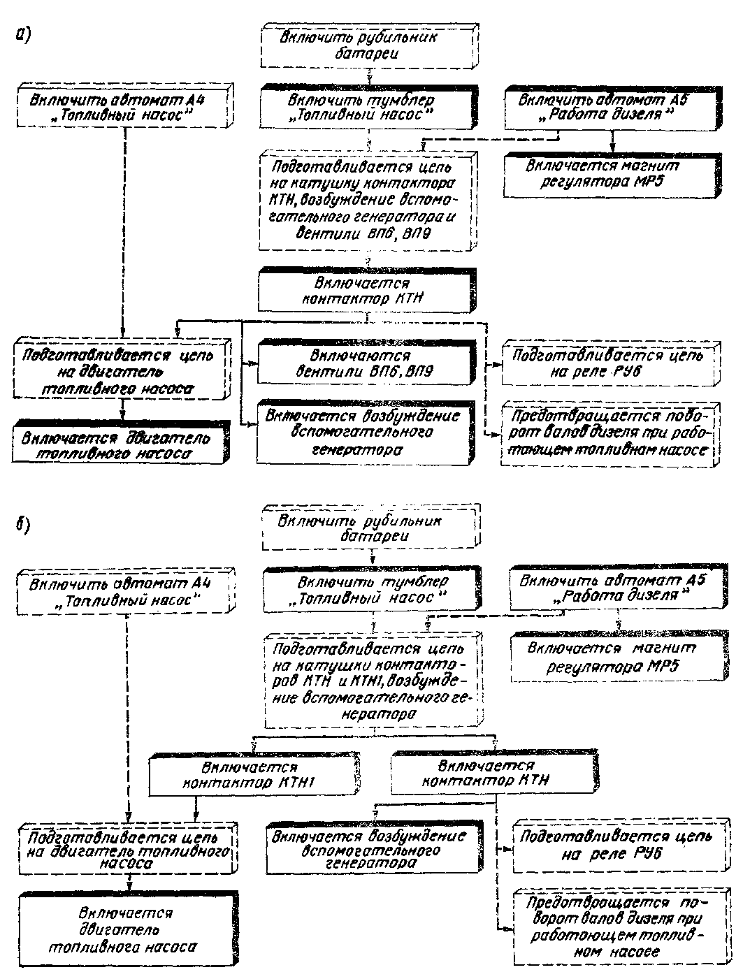 Рис. 66. Структурная схема (алгоритм) управления включением электродвигателя топливо подкачивающего насоса тепловозов типов ТЭ10М (а) н ТЭ10У (б)