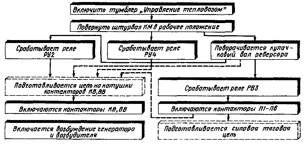 Рис. 76. Структурная схема (алгоритм) включения тягового режима тепловозов типов ТЭ10М и ТЭ10У