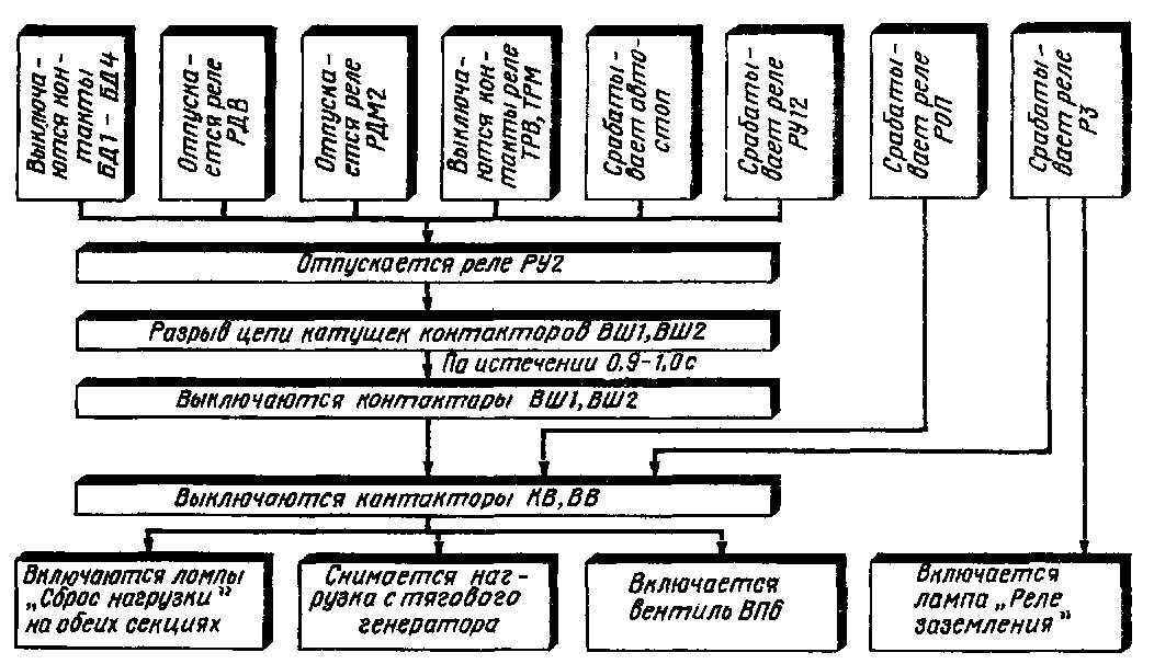 При срабатывании реле заземления РЗ или реле снятия нагрузки при обрыве перемычек полюсов ТЭД РОП разрывается непосредственно цепь питания катушек контакторов КВ и ВВ. При этом, кроме сигнальной лампы «Сброс нагрузки», на тепловозах типа ТЭ10М включается сигнальная лампа ЛРЗ «Реле заземления», а на тепловозах типа ТЭ10У—сигнальная лампа ЛРЗ «Реле заземления» или ЛРП «Обрыв поля ТЭД».