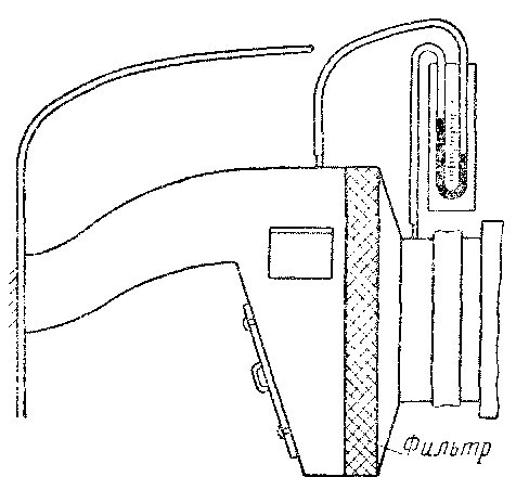 Опытом установлено, что чем больше засорён воздушный фильтр турбовоздуходувки, тем больше масла засасывается из картера и тем больше "загорание поршневых колец. В связи с этим разрежение на всасывании рекомендуется контролировать U-образным водяным манометром. При разрежении более 60 мм вод. ст. воздушный фильтр надо очищать и промывать. Схема установки манометра показана на фиг. 72.