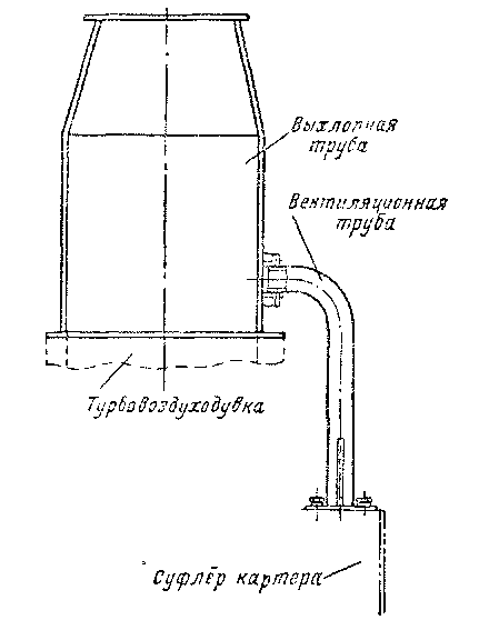 Замечено, что при наличии отсоса газов из картера вместе с газами во всасывающую полость турбовоздуходувки попадает масло, которое затем поступает в наддувочный коллектор и в цилиндры, вызывая повышенное загорание поршневых колец.