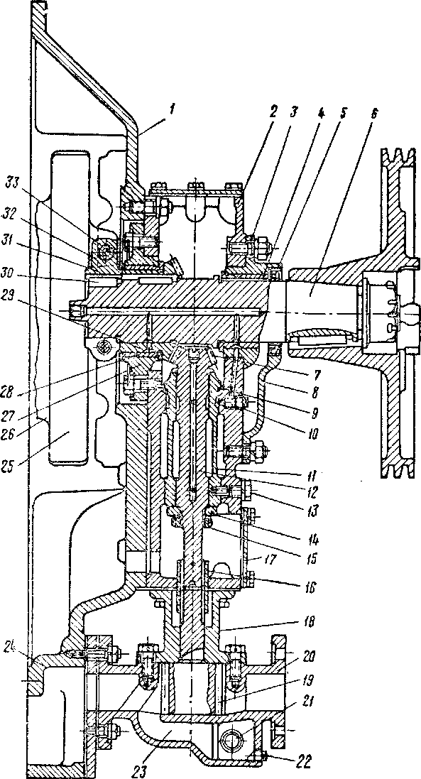 / — корпус; 2— корпус редуктора; з — шпилька; 4, 28— втулки (подшипники); 5— сальник; 6 — горизонтальный вал; 7— малая коническая шестерня; 8 — крышка; 9 — прокладки для регулировки зазора в зацеплении зубьев шестерён; 10 — штуцер; 11— бронзовая втулка; 12 — вертикальный вал привода; 13 — стопорный болт; 14 — проставочное кольцо; 15 — гайка; 16 — муфта; 17 — люк с крышкой; 18 — крышка корпуса насоса; 19 — ведущая шестерня масляного насоса; 20 — корпус масляного насоса; 21—редукционный клапан; 22 — заглушка; 23 — перепускной канал; 24 — всасывающий канал; 25 — поворотный диск; 26 — коленчатый вал; 27 — фланец; 29 — коническая шестерня; 30 — шпонка; 31 — поводок; 32 — кронштейн; 33 — болт
