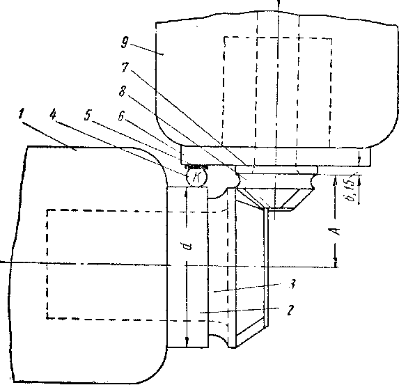 / и 5 —суппорты станка; 2 и 6 — специальные втулки; 3 и 8 — большая и малая конические шестерни привода масляного иасоса; 4 — калибр диаметра К; 5 —набор пластин щупа (толщины Щ); 7 —опорный бурт на втулке 6; А — монтажный размер; й — диаметр втулки 2