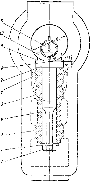 Зная диаметр ёх отверстия в корпусе 3, толщину /г плитки 7 и отклонение х стрелки индикатора 11, определяют размер А\ — расстояние от опорной поверхности бронзовой втулки 4 (для малой шестерни) до геометрической оси горизонтального вала: