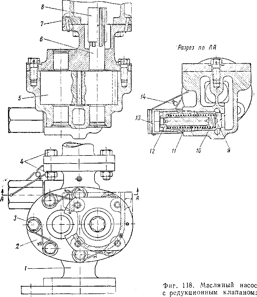Масляный насос шестерёнчатого типа состоит из бронзового корпуса 20, внутри которого размещены две цилиндрические стальные шестерни 19, имеющие 11 косых зубьев с нормальным модулем 7 мм. В нижней части корпуса масляного насоса отлит канал 23, соединяющий всасывающую и нагнетательную полости насоса и предназначенный для перепуска масла через редукционный клапан 21, отрегулированный на 5,3 ати. Редукционный клапан состоит из клапана 9 (фиг. 118), пружины 10, гайки 12 и кол-пачковой гайки 13, служащей одновременно и контргайкой. При давлении 5,3 ати клапан 9, преодолевая усилие пружины 10, открывается и перепускает масло из нагнетательной полости по каналу 23 (см. фиг. 115) обратно во всасывающую полость насоса. Такое действие редукционного клапана предохраняет масляный насос от перегрузки.